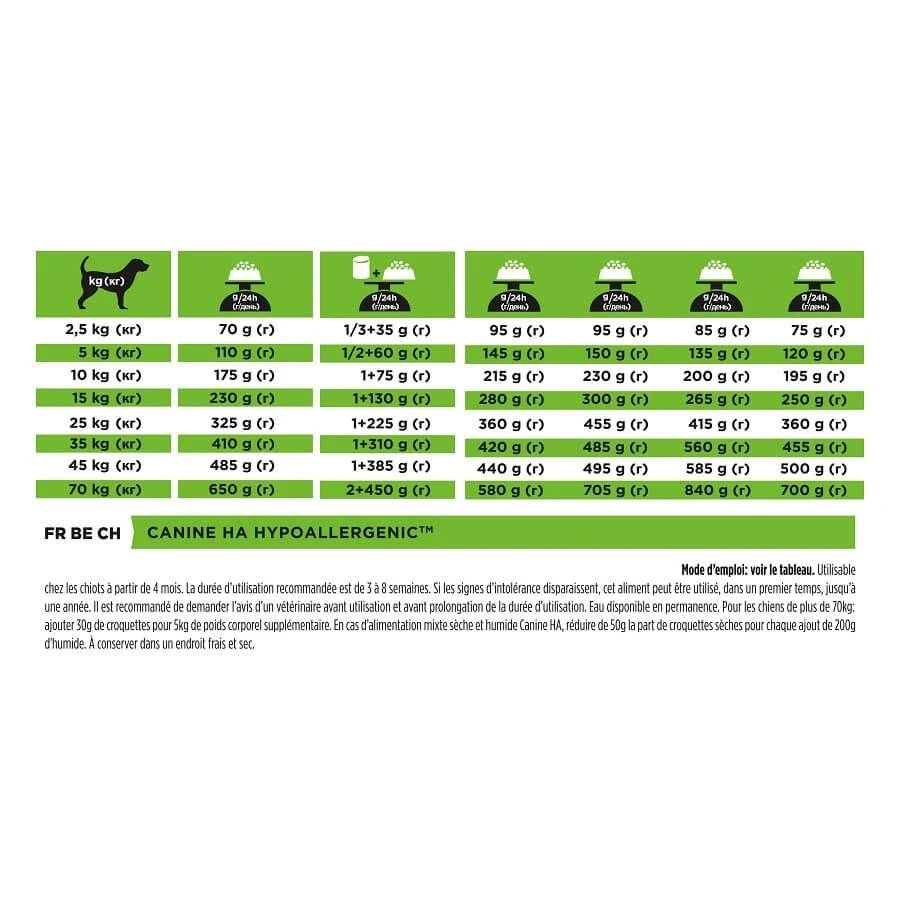 L’alimentation Proplan Canine Hypoallergenic HA est formulée avec une seule source de protéines et des sources de glucides purifiés. De plus, les protéines ont été coupées (hydrolysées) en petits morceaux ce qui aide à limiter les réactions allergiques. Durant cette période d’essai, il est essentiel pour votre animal de le nourrir exclusivement avec Canine HA et de ne pas lui donner d’autres aliments ou friandises pendant 8 à 10 semaines.